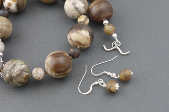 | VERSTEEND HOUT Ketting/oorhanger-set bestaande uit versteend hout (8 en 16 mm.), bruine agaat (2 mm.), Sterling zilveren slotje en afwerking. De oorhanger meet 8 mm. en is van Sterling zilver. Voor en goed begrip: dit is geen gewoon hout. Het is steen (!) geworden, gefossiliseerd hout met als resultaat dat je de houtstructuren ziet. |