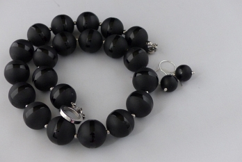Ketting/oorhanger-set onyx (mat, 18 mm.), rvs-kralen (3 mm.), Sterling zilveren onyx (12 mm.) oorhangers, rvs-kapittelslot