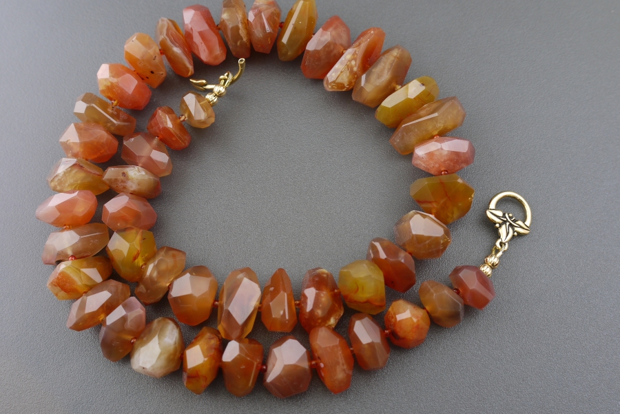 | Kornalijn Ketting/oorhanger-set bestaande uit gefacetteerde kornalijn (free shape - 12 tot 25 mm.) en kleine carneool(2 mm.), Tierracast slotje. Ook de goldfilled oorhangers bevatten kornalijn. Kornalijn met een heldere, lichte kleur. |