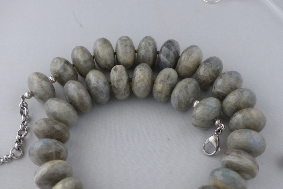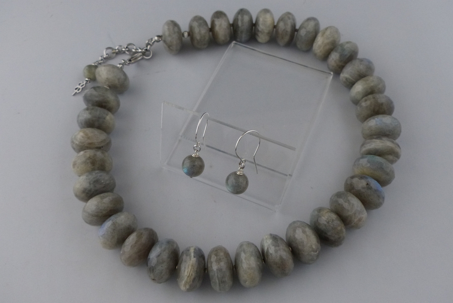 Ketting/oorhanger-set bestaande uit gefacetteerde labradoriet rondellen (9 x 20 mm), rvs-kralen (1,5 mm.), rvs-slotje en -verlengkettinkje. De oorhangers (10 mm.) zijn van Sterling zilver. De rondellen geven deze ketting een krachtige uitstraling. De kleur is rustig en gelijkmatig met een aantal labradoriet ertussen, die over zo'n schitterende blauwe flash beschikken. |