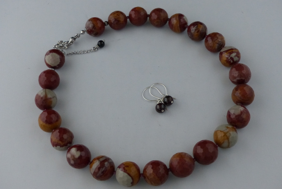 Ketting/oorhanger-set van morena jaspis (16 mm.), fijn gefacetteerd, rode granaat (2 mm.), Sterling zilveren granaat oorhangers (8 mm.), rvs-slotje en verlengkettinkje. Een bijzondere kleur jaspis. |