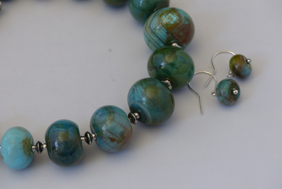 Ketting/oorhanger-set van agaat (variërend van 12 x 9 tot 30 x 20 mm.), rvs-kralen 2,5 en 5 mm., Sterling oorhangers (10 mm.), rvs-afwerking.