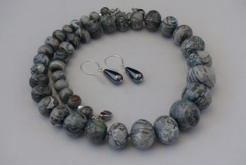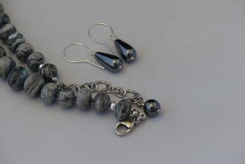 Ketting/oorhanger-set van jaspis (van 15 tot 8 mm.), hematiet (1,5 mm.), Sterling zilveren afwerking en hematiet druppelvormige oorhangers)