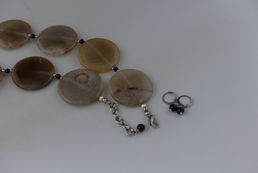 Ketting/oorhanger-set van agaat (40 mm. schijfjes), onyx (4 mm.) en rvs (2 mm.). Rvs-afwerking en -oorhangres (6 mm. agaat), verlengkettinkje. De schijfjes vallen op door kleur en vorm. |