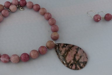 Ketting/oorhanger-set van rhodoniet (gefacetteerd 12 mm.), Sterling zilveren slotje, -oorhangers en -verlengkettinkje, rvs-kralen (1,5 mm.), rhodoniet-hanger van 5 x 3,5 cm. Een mooie, aparte kleur en bijpassende hanger. |