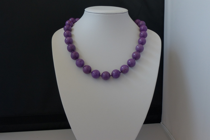 Ketting/oorhanger-set van phosphosiderite (14 mm.), amethist (2 mm.), Sterling zilveren kapittelslotje (verlengbaar), -oorhangers (8 mm.) Dit is een aparte steensoort, echt niet-alledaags met een bijzondere kleur. |