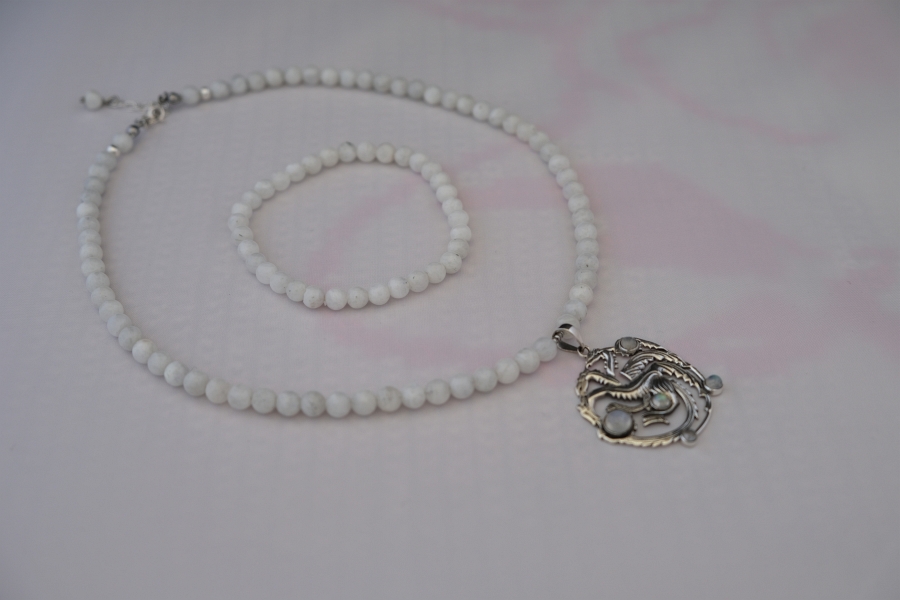 Ketting/armband-set van maansteen (6 mm.), Sterling zilveren slotje en -verlengkettinkje. De Sterling zilveren hanger (doorsnede 3,5 cm.) bevat maansteen (3 tot 5 mm.). Het bijpassende armbandje is eveneens van maansteen (6 mm.) en geregen op elastiek Een verfijnde ketting met dito hanger (in de vorm van een draak) en armbandje. |