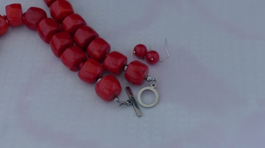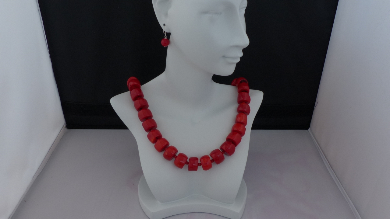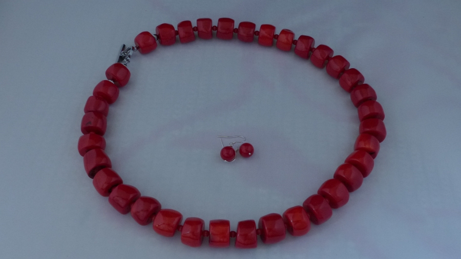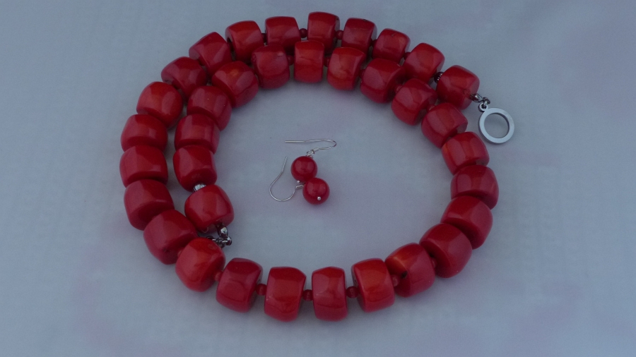Ketting/oorhanger-set van koraal (4 en 17 mm.), rvs kapittelslot, Sterling zilveren oorhanger (8 mm.)