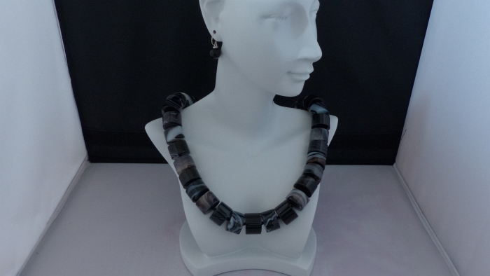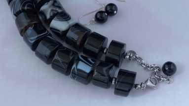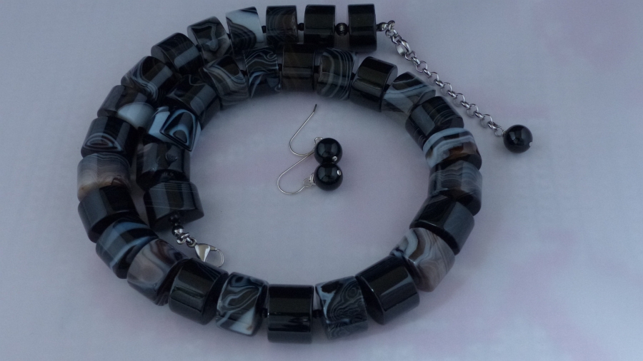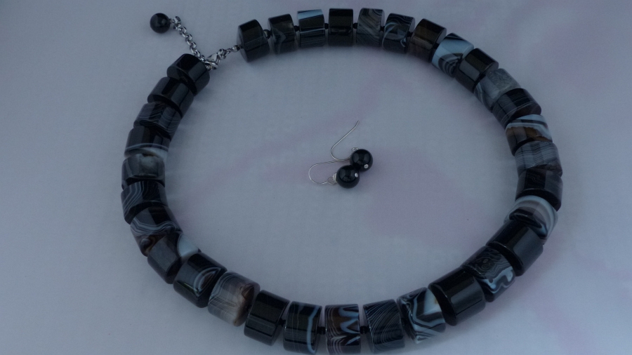 Ketting/oorhanger-set van sardonyx (19 mm.), onyx (3 mm.), rvs-slotje met verlengkettinkje, Sterling zilveren oorhanger (10 mm.) Zowel qua vorm als kleur opvallend. |