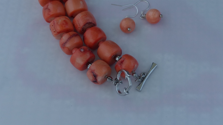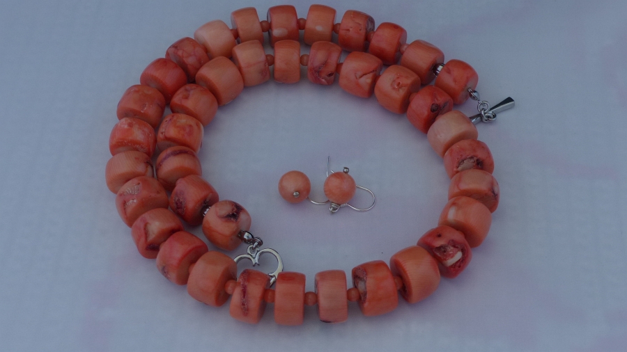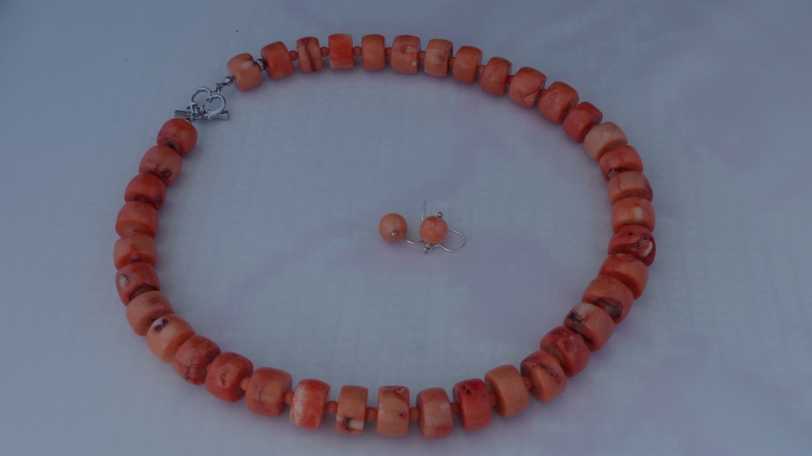Ketting/oorhanger-set van koraal (3 en 16 mm.), Sterling zilveren oorhanger (10 mm.), rvs kapittelslotje.