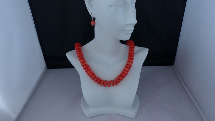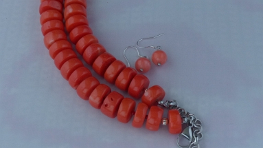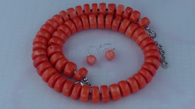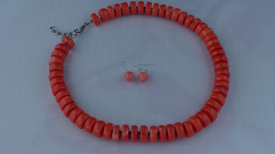 Ketting/oorhanger-set van koraal (2 en 15 mm.), rvs slotje met verlengkettinkje, Sterling zilveren oorhanger (9 mm.)