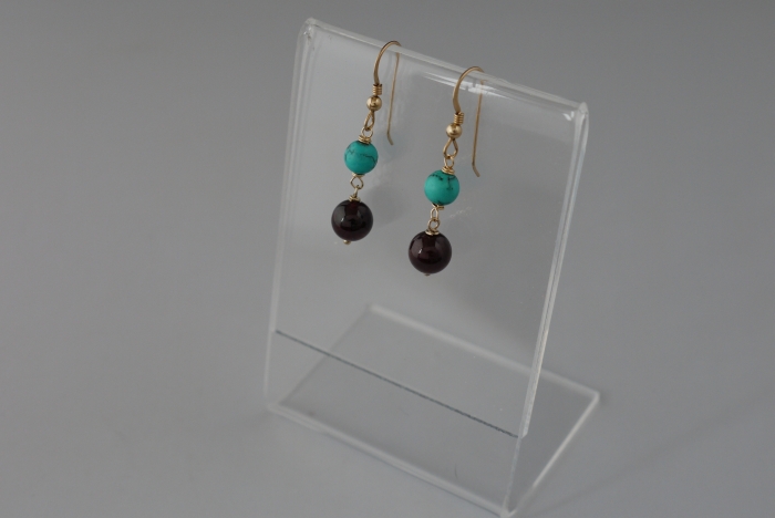 Oorhanger bestaande uit granaat (6 mm.) en turquoise (8 mm.) Goldfilled.